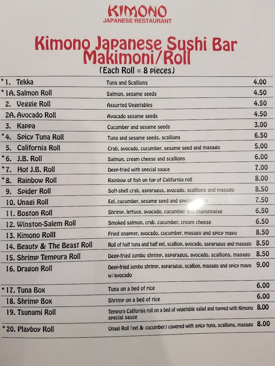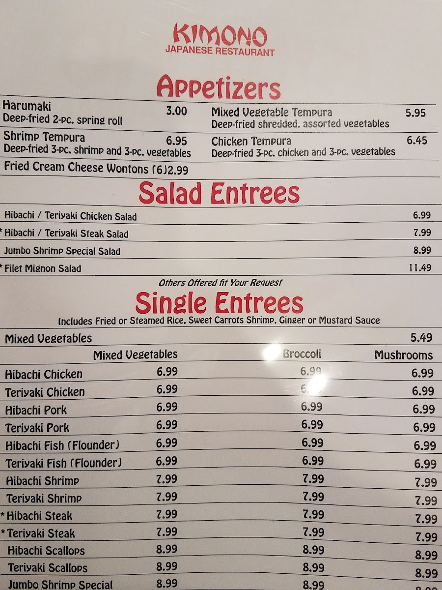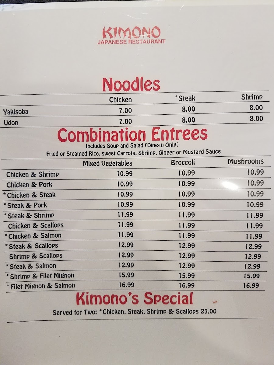 Kimono Japanese Restaurant Menu